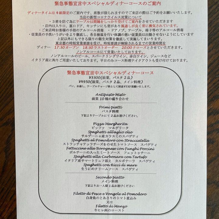 2枚目の写真、緊急事態宣言中スペシャルディナーコースやってます。