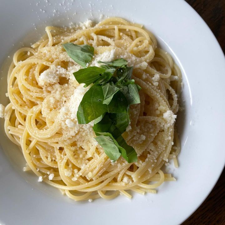 茹でたスパゲティにオリーブオイルとパルミジャーノ、バジルを乗せただけの賄いパスタ