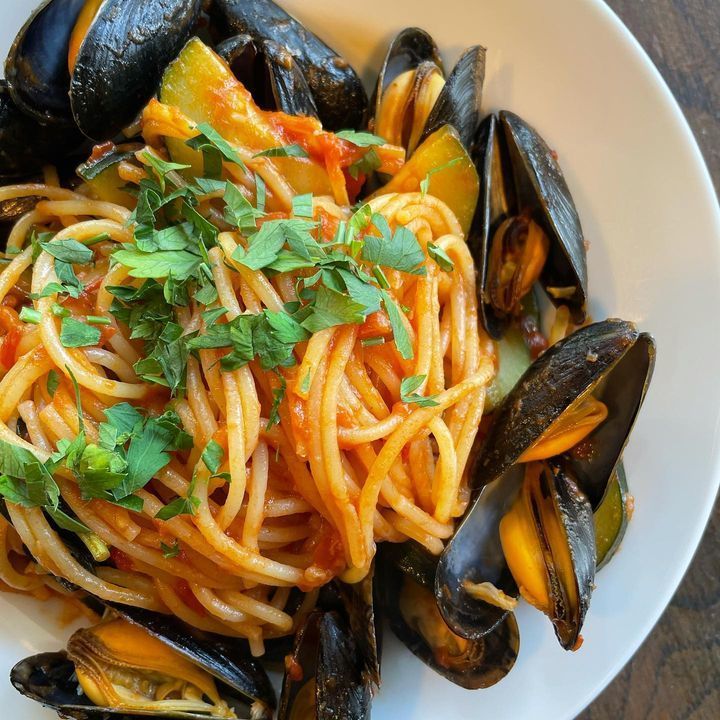 旨味の溶け込んだトマトソースと小ぶりながら美味しいムール貝をパスタに絡めてお召し上がりください。